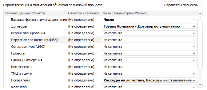 Настройте связи отметок в сегментах данных объекта полномочий с параметрами процесса в области «Параметризация и фильтрация объектов полномочий процесса». В раскрывающемся списке «Связь с параметрами/Фильтр» выберите один из переключателей:
