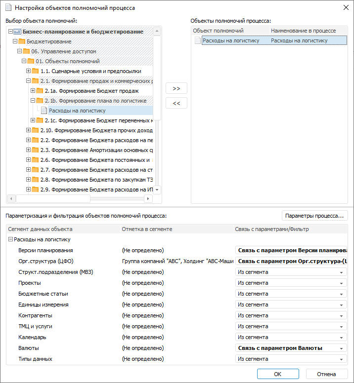 Окно настройки объектов полномочий процесса предназначено для определения объектов полномочий, используемых в рамках процесса, и настройки связи отметок в сегментах данных объекта с параметрами процесса. Для корректной работы объектов полномочий убедитесь, что настроено серверное исполнение процессов.