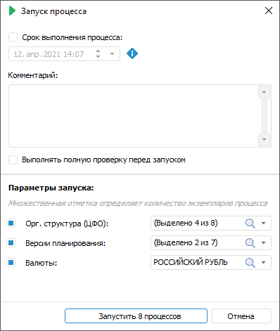 На приведённом выше примере в запуск включены параметры «Организационная структура» (4 организации), «Версии планирования» (2 версии планирования) и «Валюты» (1 валюта). Таким образом, количество комбинаций параметров равняется 8 и, соответственно, будет запущено 8 экземпляров процесса для каждой комбинации параметров. Если флажок снят, то в качестве значения неотмеченного параметра будут приниматься все его выделенные элементы.