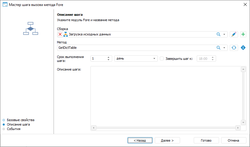 1. Настройка базовых свойств шага. После определения базовых свойств шага нажмите кнопку «Далее».
