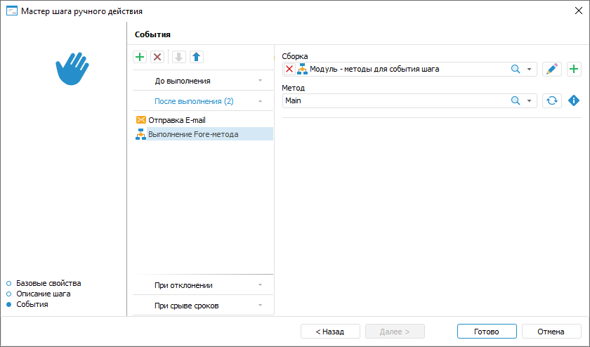 Для настройки событий, выполняемых автоматически при запуске выполнения шага или после его завершения, используйте страницу «События» мастера шага: