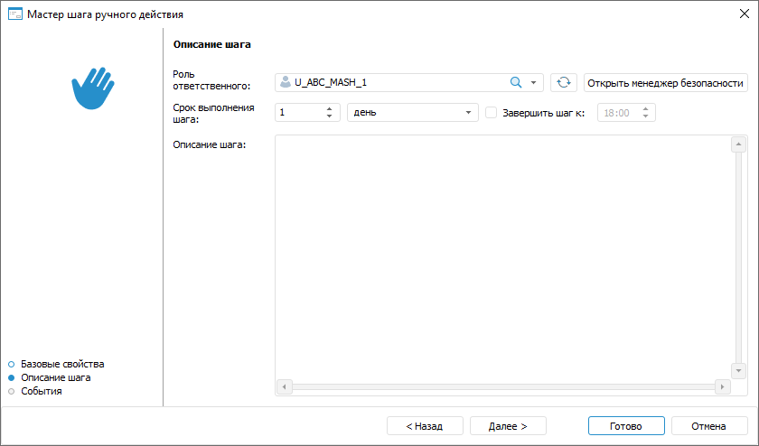 Шаг «Ручное действие» предназначен для описания задач, выполнение которых подразумевает действия человека без использования каких-либо автоматизированных механизмов выполнения. Например, подписание договора или разгрузка товара.