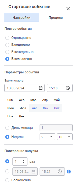 1. Задайте дату и время запуска процесса в группе параметров «Параметры событий» в поле «Время старта». Для изменения даты выберите дату в раскрывающемся календаре. Для изменения времени запуска установите значение с клавиатуры.