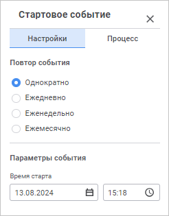 Для настройки автоматического запуска процесса по таймеру на панели параметров «Стартовое событие»: