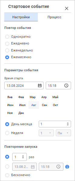 • По дням. Выберите день запуска. Процесс будет запускаться в указанный день каждого месяца;
