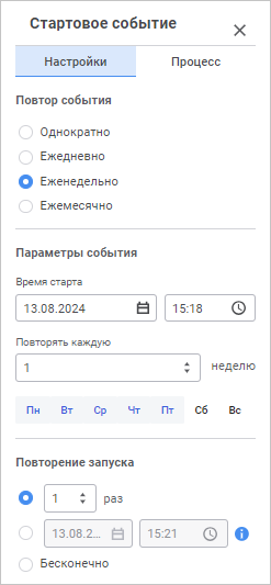 Примечание. Если для события было настроено повторение запуска процесса более одного раза, до определенного срока или бесконечно, то в правой части блока стартового события отобразится значок  после запуска процесса.