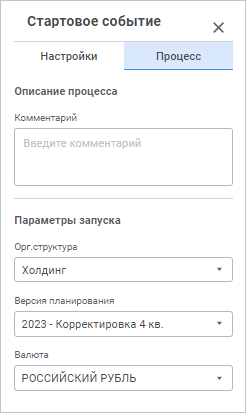 Примечание. Для настройки стартового события нажмите кнопку  «Настройки» на панели инструментов, предварительно выделив его. Будет открыта панель параметров «Стартовое событие».