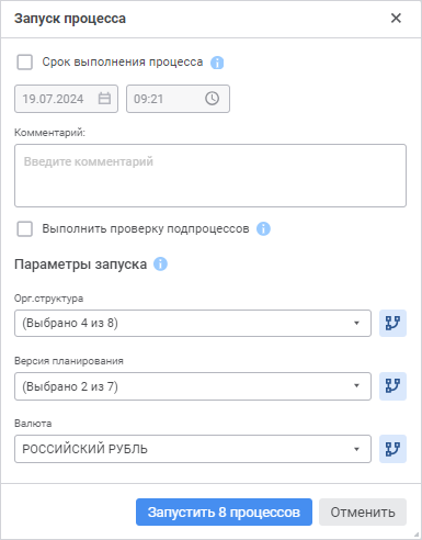 На приведённом выше примере в запуск включены параметры «Организационная структура» (4 организации), «Версии планирования» (2 версии планирования) и «Валюты» (1 валюта). Таким образом, количество комбинаций параметров равняется 8 и, соответственно, будет запущено 8 экземпляров процесса для каждой комбинации параметров. Если флажок снят, то в качестве значения неотмеченного параметра будут приниматься все его выделенные элементы.