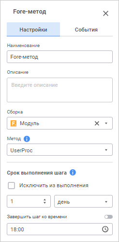 Для настройки выполнения Fore-метода определите обязательные параметры на панели параметров выбранного события: