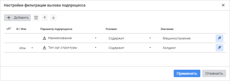 Примечание. Набор отображаемых типов условия зависит типа данных атрибута, выбранного в столбце «Параметр подпроцесса».
