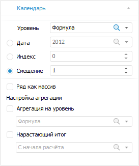 Агрегация позволят использовать в формуле несколько значений элементов из измерения операнда, агрегированных выбранным способом. Агрегация может быть настроена по любому измерению операнда, кроме календарного.