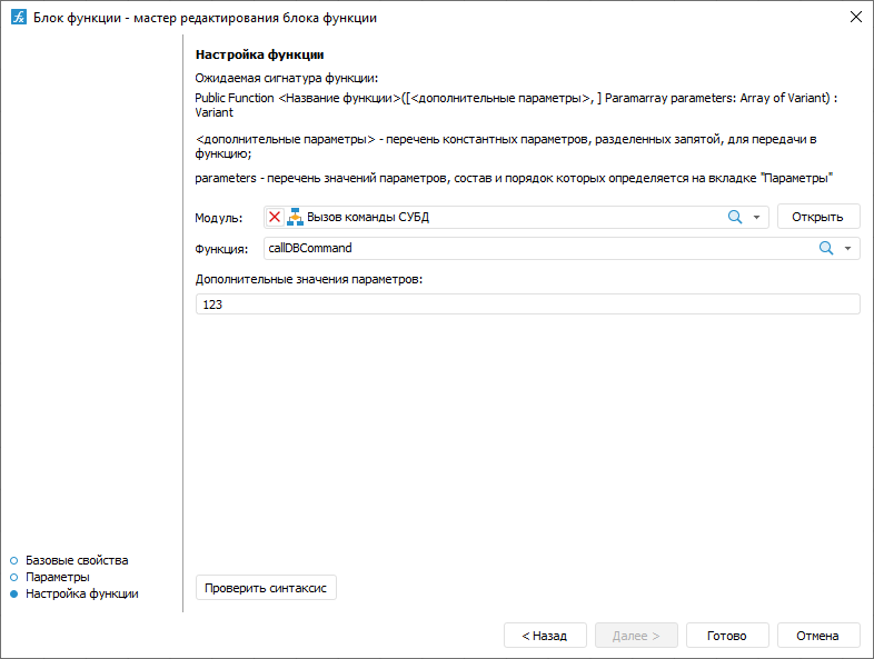 Примечание. Если дополнительные параметры не заданы в сигнатуре функции, но заданы на странице «Настройка функции» в мастере редактирования блока функции, то они будут содержаться перед значениями параметров блока в переменной parameters.
