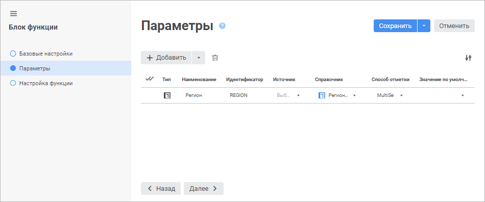 Добавление параметров блока функции выполняется на странице «Параметры» в мастере редактирования блока функции: