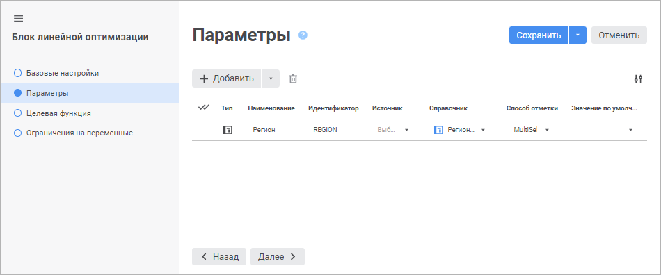 Добавление параметров блока линейной оптимизации расчёта выполняется на странице «Параметры» в мастере редактирования блока линейной оптимизации: