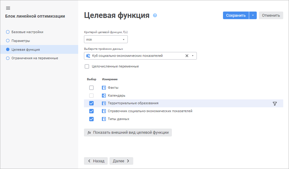 Выбор цели оптимизации целевой функции, управляющих переменных и приёмника данных, в который будут выгружены результаты оптимизации выполняется на странице «Целевая функция» в мастере редактирования блока линейной оптимизации: