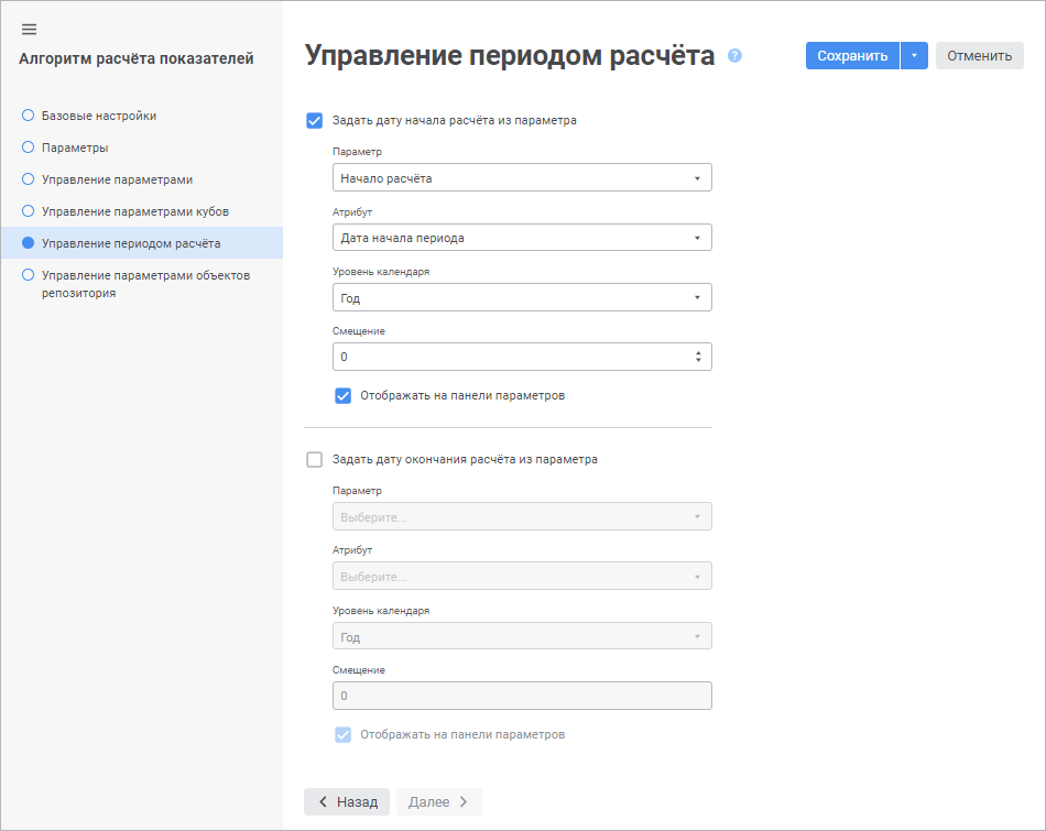 Для выбора и настройки параметра, управляющего началом или окончанием расчёта, установите флажок «Задать дату начала расчёта из параметра» или «Задать дату окончания расчёта из параметра» соответственно, после чего задайте настройки: