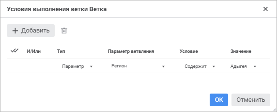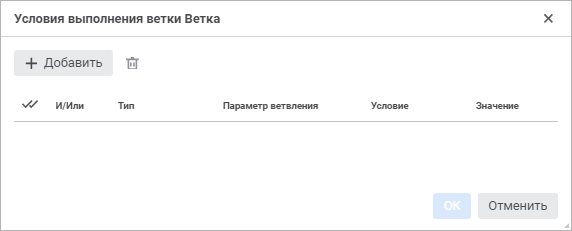 В результате будет открыто окно «Условия выполнения ветки <наименование ветки>»: