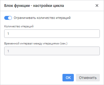 Ограничивать количество итераций. При необходимости переведите переключатель в неактивное состояние для остановки циклического расчёта блока функции с помощью пользовательской функции или вручную. По умолчанию переключатель переведен в активное состояние, циклический расчёт будет выполняться по заданному количеству итераций.