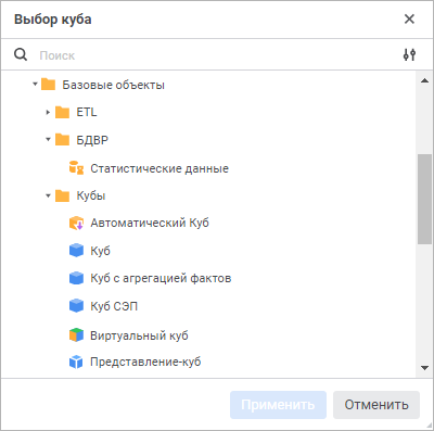 После выполнения действия будет открыто окно «Выбор куба»: