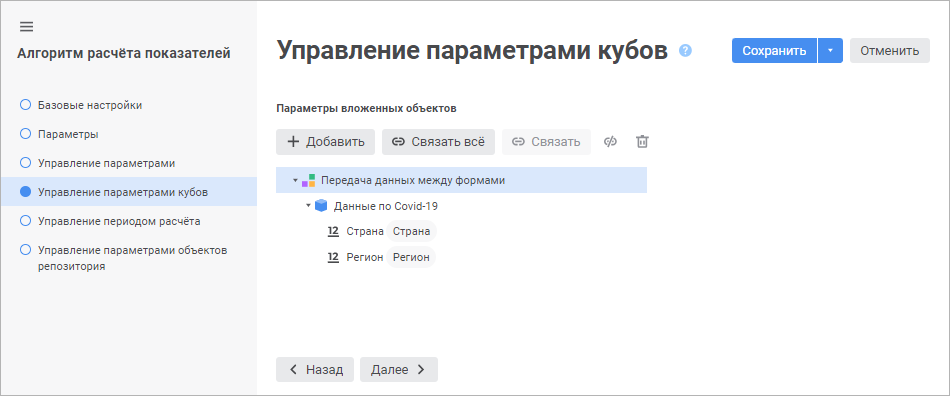 Задание связей параметров алгоритма расчёта с параметрами кубов выполняется на странице «Управление параметрами кубов» в мастере редактирования настроек алгоритма расчёта: