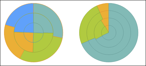Пример отображения круговой диаграммы с рядами в кольцах (слева) и секторно (справа):