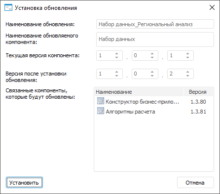 После выбора файла будет открыто окно «Установка обновления», в котором отображаются наименования обновления и обновляемого компонента, номера текущей версии компонента и его версии после установки обновления, а также наименования и номера версий связанных компонентов, которые будут обновлены. Нажмите кнопку «Установить»: