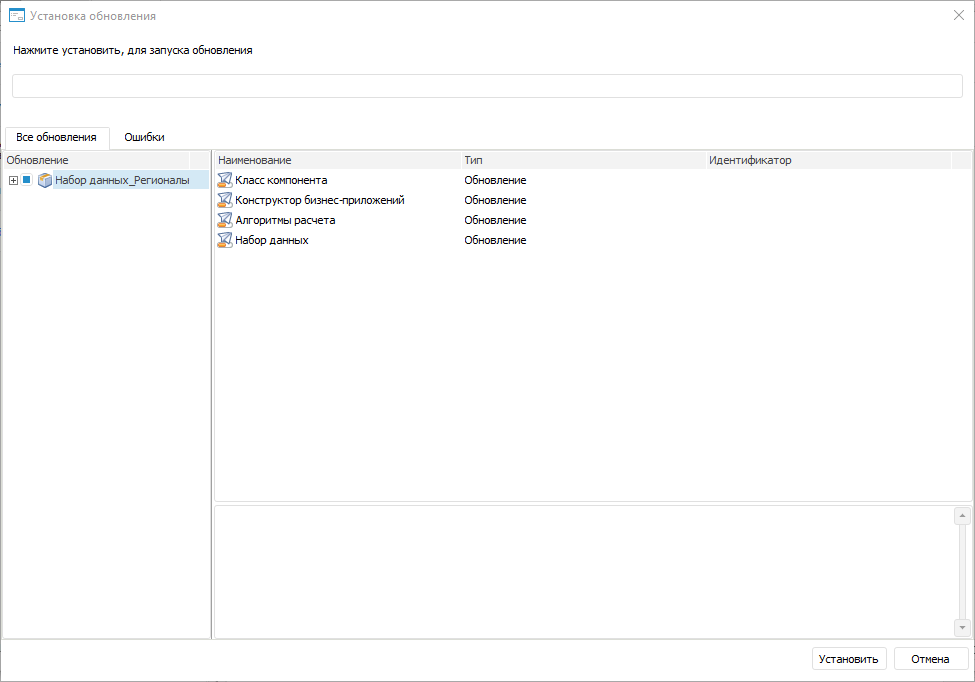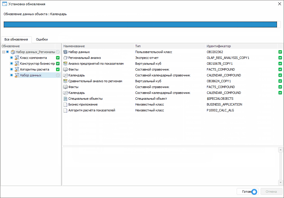Примечание. При наличии ошибок перейдите на вкладку «Ошибки» для детального просмотра. После доработки объектов компонента сформируйте заново обновление и установите его.
