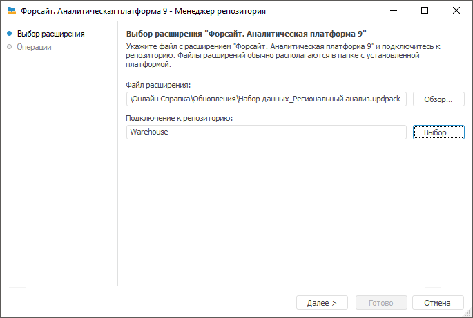Выберите файл с пакетом обновлений приложения и укажите репозиторий, в который будет установлен компонент.