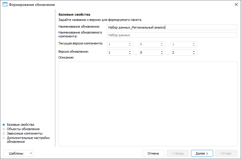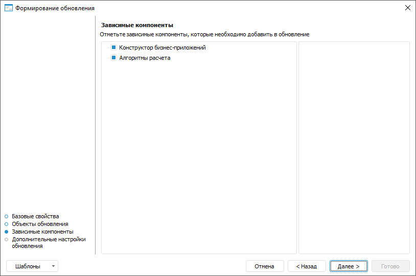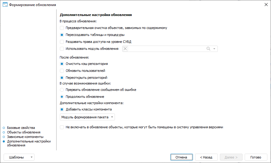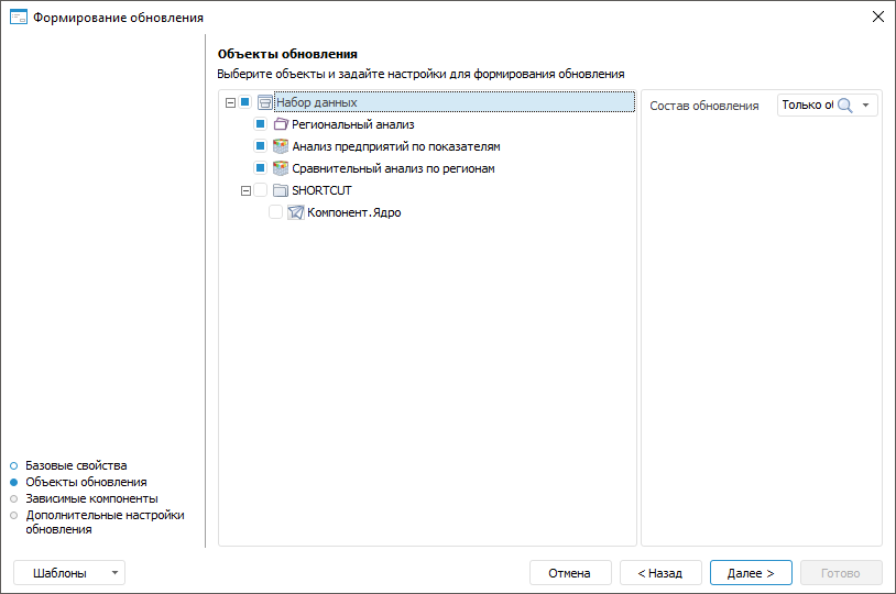 При необходимости настройки формирования обновлений возможно сохранить в шаблон в формате *.xml для повторного использования. В шаблон сохраняются: наименование обновления, список всех объектов с установленным составом обновления и состояние отметки (флажок установлен /не установлен), дополнительные настройки. В шаблон не сохраняется состояние отметки по обновлению зависимых компонентов, флажки установлены всегда по умолчанию. Нажмите на кнопку «Шаблоны» и выберите из списка один из вариантов: