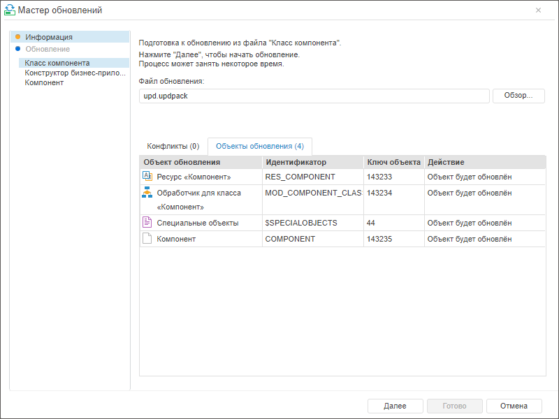Установка обновления с расширением *.updpack в веб-приложении состоит из подготовки и установки отдельных файлов, перечисленных на боковой панели мастера обновлений. На этапе подготовки каждого из файлов на вкладке «Объекты обновления» отображаются объекты, которые будут обновлены на текущем этапе.