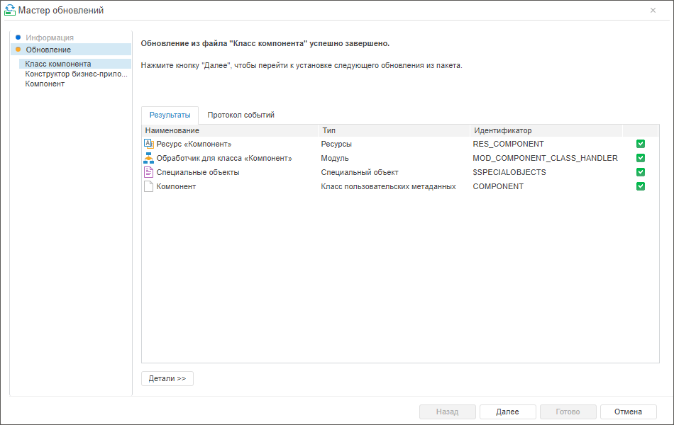 При нажатии на кнопку «Далее» будет произведена установка выбранного пакета обновлений для приложения.