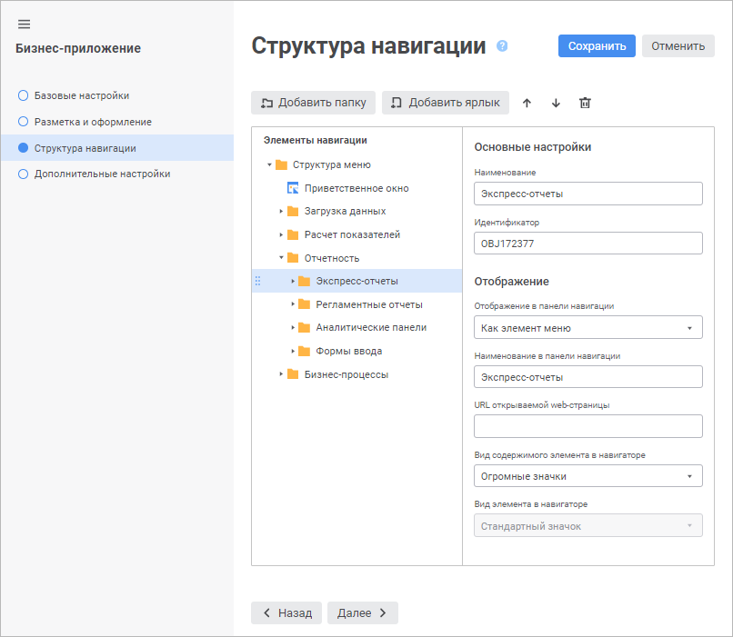 Настройка структуры элементов меню на панели навигации выполняется на странице «Структура навигации» в мастере создания бизнес-приложения.