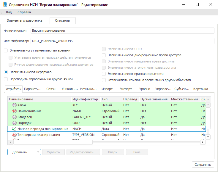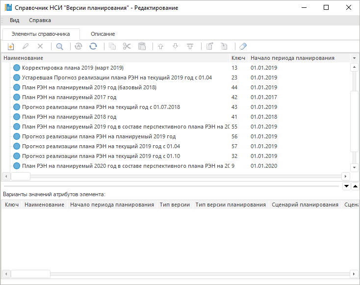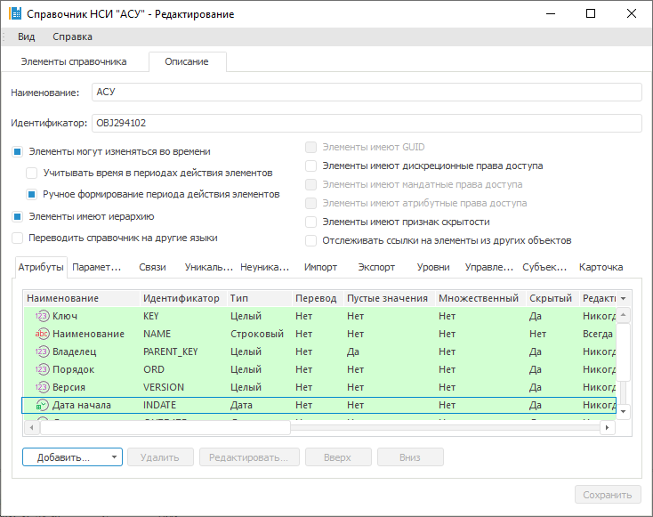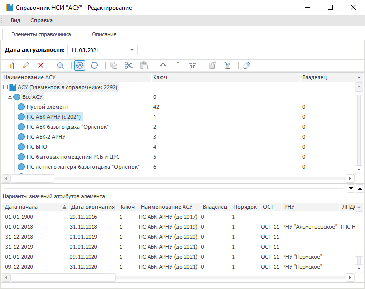 Для элемента «ПС АБК АРНУ» для разных дат указаны различные значения атрибутов справочника: «Наименование», «ОСТ», «РНУ» и прочие.