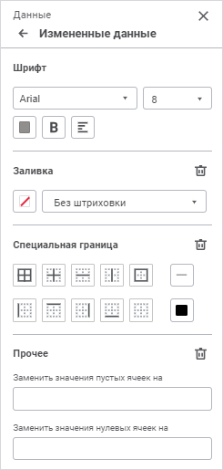 Для настройки оформления данных, измененных в таблице, но еще не сохраненных в табличной области используйте группу параметров «Измененные данные» панели параметров: