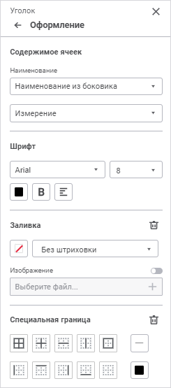 Уголок. Доступны настройки: содержимое ячеек, шрифт, заливка и специальная граница;