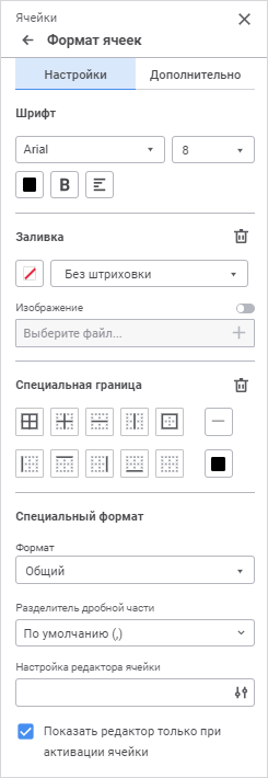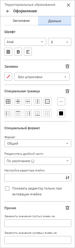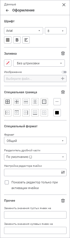 Данные. Доступны настройки: шрифт, заливка, специальная граница, прочее;
