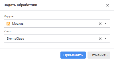 Класс. Выберите из раскрывающегося списка класс, в котором располагается обработчик событий. Выбрать можно один класс. Список становится доступным после выбора модуля, если в нём описан класс, унаследованный от класса ReportEvents и содержащий реализацию методов для обработки событий форм ввода.
