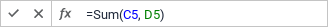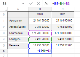 Для задания или редактирования значения/формулы активной ячейки щёлкните по строке формул и определите новое значение/формулу. Ввод формулы начинается со знака равенства (=). При редактировании формулы адреса используемых ячеек выделяются разным цветом. Цвет адреса ячейки в строке формул соответствует цвету ячейки на рабочей области: