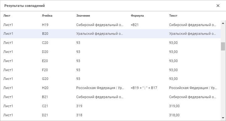 При выделении строки с найденным значением фокус перейдёт в искомую ячейку отчёта на рабочей области.