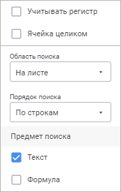 Текст. По умолчанию флажок установлен. Поиск будет осуществляться по тексту, отображаемому в ячейках;