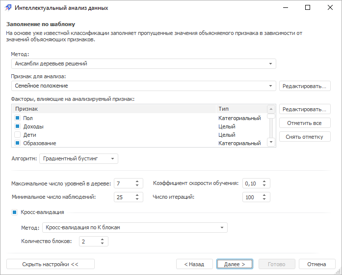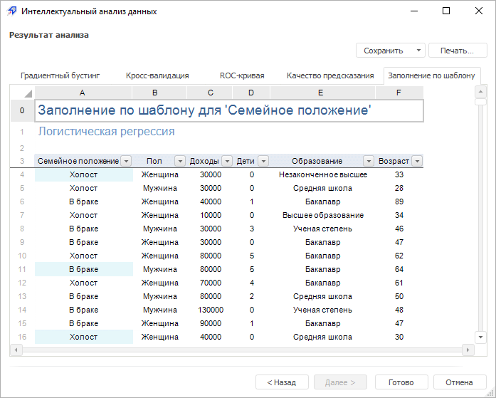 Данный вид анализа заполняет пропущенные значения объясняемого признака в зависимости от значений объясняющих признаков на основе имеющейся классификации.
