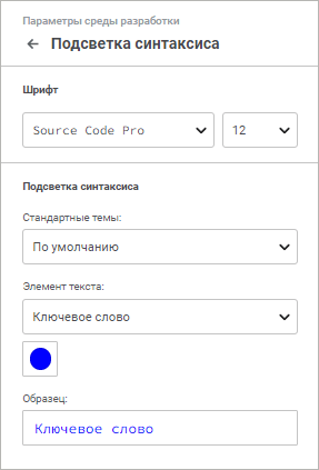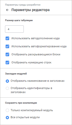 При этом будет открыта панель параметров, содержащая три группы настроек в веб-приложении или окно «Параметры среды разработки», содержащее четыре вкладки, в настольном приложении.