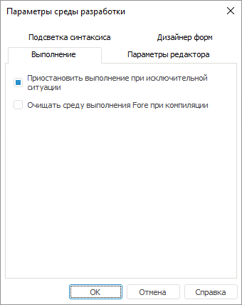 Приостановить выполнение при исключительной ситуации. Установка флажка приводит к приостановке выполнения программы при возникновении исключительных ситуаций. По умолчанию флажок установлен;