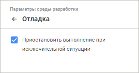 Группа «Отладка»/вкладка «Выполнение» содержит настройки, определяющие порядок поведения при возникновении исключительных ситуаций во время отладки пользовательской сборки/модуля/формы.