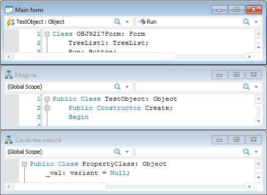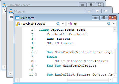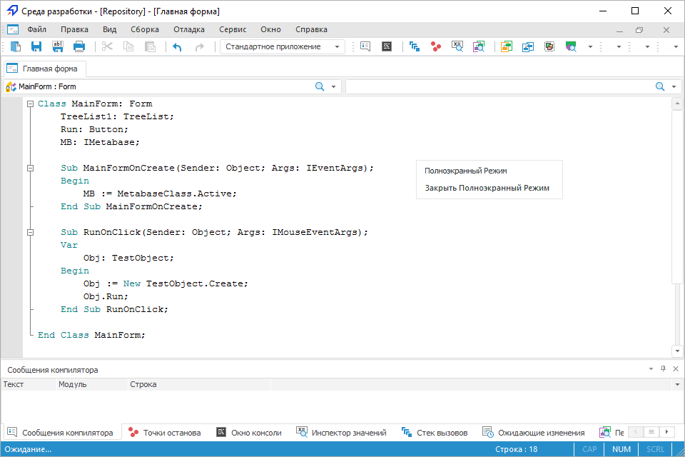 Окно среды разработки в настольном приложении состоит из ряда панелей, предназначенных для создания и настройки пользовательских форм, модулей и сборок. Наименование основного окна среды разработки содержит наименование репозитория и наименование текущего открытого объекта.
