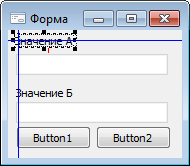 При совпадении координат либо отступов компонентов на форме будут отображаться вспомогательные линии, по которым и осуществляется ориентация компонента. Линии допустимых границ формы и границ компонентов отображаются синим цветом. Линии, отражающие минимальное допустимое расстояние между компонентами, отображаются красным цветом.