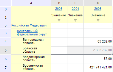 Для выполнения примера необходимо наличие на html-странице компонента ExpressBox с наименованием «expressBox» (см. «Пример создания компонента ExpressBox») и с загруженной таблицей в рабочей области экспресс-отчета. Установим тип выделения, равный значению «row», и затем выделим пятую строку в таблице: