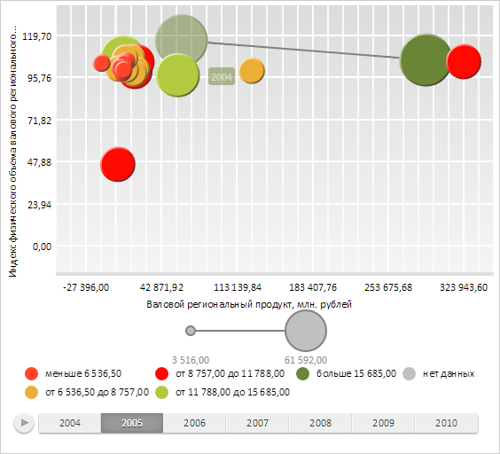 Для выполнения примера необходимо наличие на html-странице компонента BubbleChart с наименованием «bubbleChart» (см. «Пример создания компонента BubbleChart»). Изменим шаг временной шкалы и перерисуем историю одного из пузырьков: