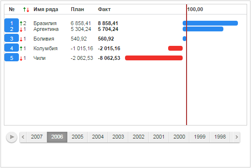 Для выполнения примера предполагается наличие на странице компонента RatingChart с наименованием «ratingChart» (см. «Пример создания компонента RatingChart»). Перейдем на второй шаг временной шкалы, после чего отобразим шаг анимации изменения позиции и графика первого ряда данных: