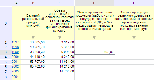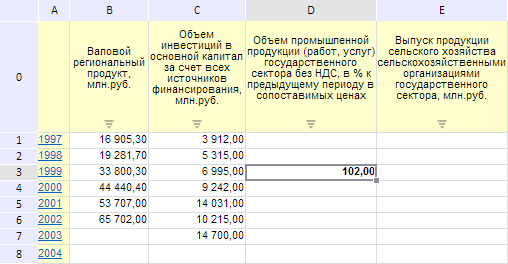 Для выполнения примера необходимо наличие на html-странице компонента ExpressBox с наименованием «expressBox» (см. «Пример создания компонента ExpressBox») и с загруженной таблицей в рабочей области экспресс-отчёта. Добавим в произвольную ячейку данной таблицы значение 102 (при этом несохраненное значение будет отмечено полужирным шрифтом):